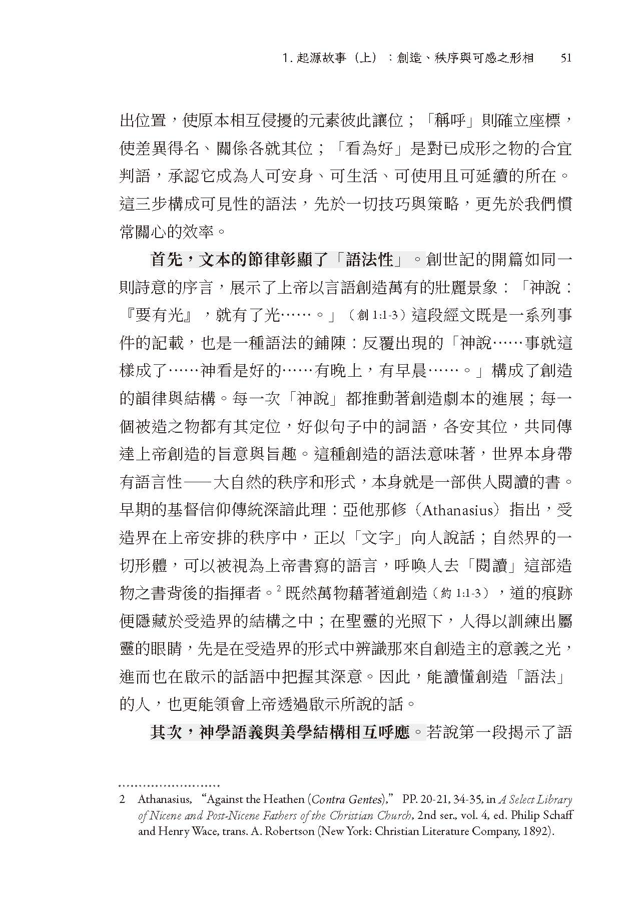 首先,文本的節律彰顯了「語法性」。創世記的開篇如同一則詩意的序言,展示了上帝以言語創造萬有的壯麗景象:「神說:『要有光』,就有了光……。」(創1:1-3)這段經文既是一系列事件的記載,也是一種語法的鋪陳:反覆出現的「神說……事就這樣成了……神看是好的……有晚上,有早晨……。」構成了創造的韻律與結構。每一次「神說」都推動著創造劇本的進展;每一個被造之物都有其定位,好似句子中的詞語,各安其位,共同傳達上帝創造的旨意與旨趣。這種創造的語法意味著,世界本身帶有語言性―大自然的秩序和形式,本身就是一部供人閱讀的書。早期的基督信仰傳統深諳此理:亞他那修(Athanasius)指出,受造界在上帝安排的秩序中,正以「文字」向人說話;自然界的一切形體,可以被視為上帝書寫的語言,呼喚人去「閱讀」這部造物之書背後的指揮者。既然萬物藉著道創造(約1:1-3),道的痕跡便隱藏於受造界的結構之中;在聖靈的光照下,人得以訓練出屬靈的眼睛,先是在受造界的形式中辨識那來自創造主的意義之光,進而也在啟示的話語中把握其深意。因此,能讀懂創造「語法」的人,也更能領會上帝透過啟示所說的話。