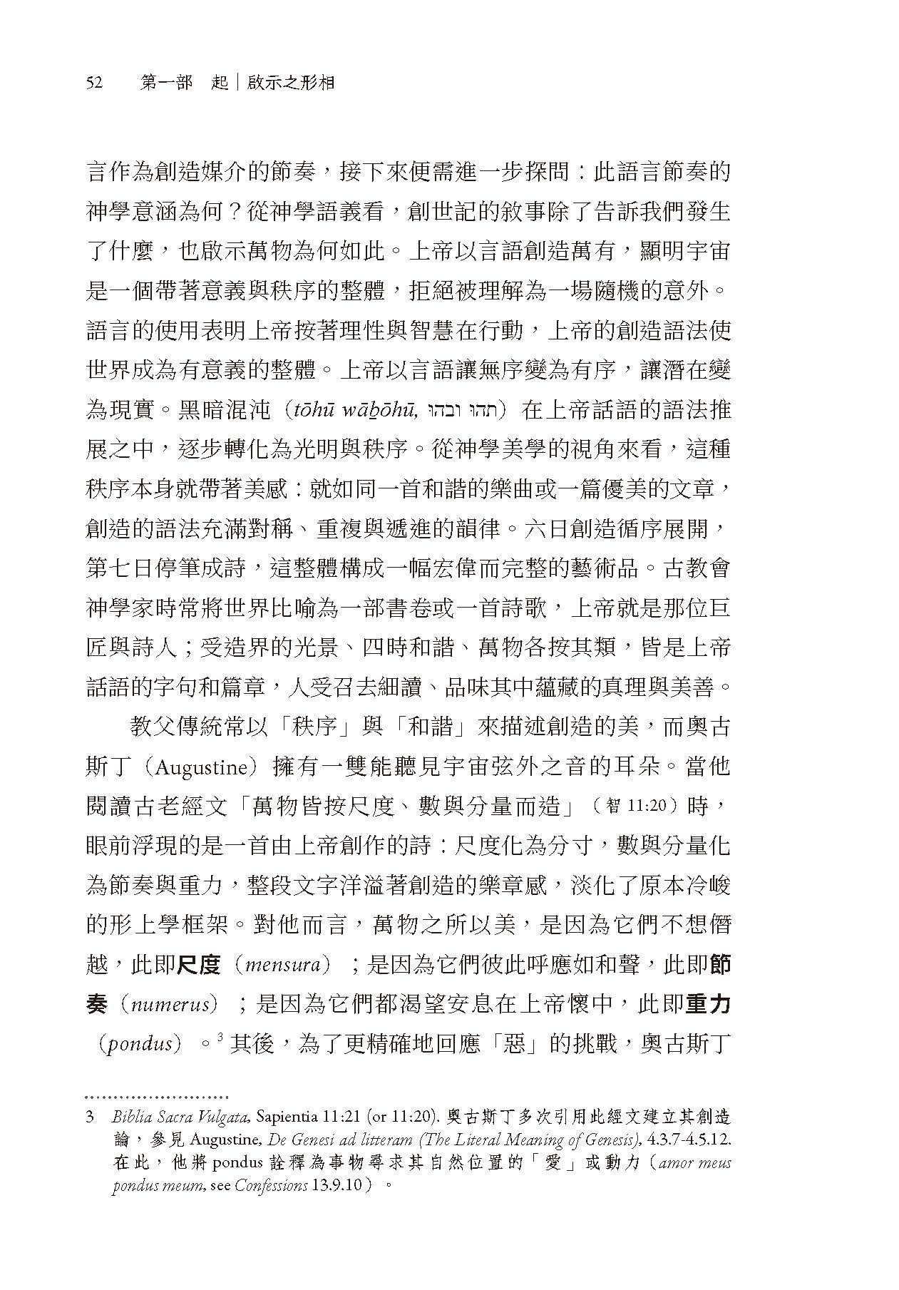 教父傳統常以「秩序」與「和諧」來描述創造的美,而奧古斯丁(Augustine)擁有一雙能聽見宇宙弦外之音的耳朵。當他閱讀古老經文「萬物皆按尺度、數與分量而造」(智11:20)時,眼前浮現的是一首由上帝創作的詩:尺度化為分寸,數與分量化為節奏與重力,整段文字洋溢著創造的樂章感,淡化了原本冷峻的形上學框架。對他而言,萬物之所以美,是因為它們不想僭越,此即尺度(mensura);是因為它們彼此呼應如和聲,此即節奏(numerus);是因為它們都渴望安息在上帝懷中,此即重力(pondus)。3 其後,為了更精確地回應「惡」的挑戰,奧古斯丁在《善之本性》(De natura boni)中進一步用更精練的語彙總結這份美:分寸(modus)、樣式(species)與秩序(ordo)。這不單是名詞的轉換,也是價值的昇華:當萬物守住分寸(節制),展現賦予意義的樣式(形相),並安於上帝所設的整體秩序之中,創造的交響樂便由此而生。這份美學視角,正與創世記的敘事遙相呼應:上帝的「分開」劃出了萬物安全的尺度;祂的「稱呼」穩住了萬物獨特的樣式;而上帝「看為好」,則是對那整體秩序的終極肯定―承認其合宜與美善,因而值得讚美。