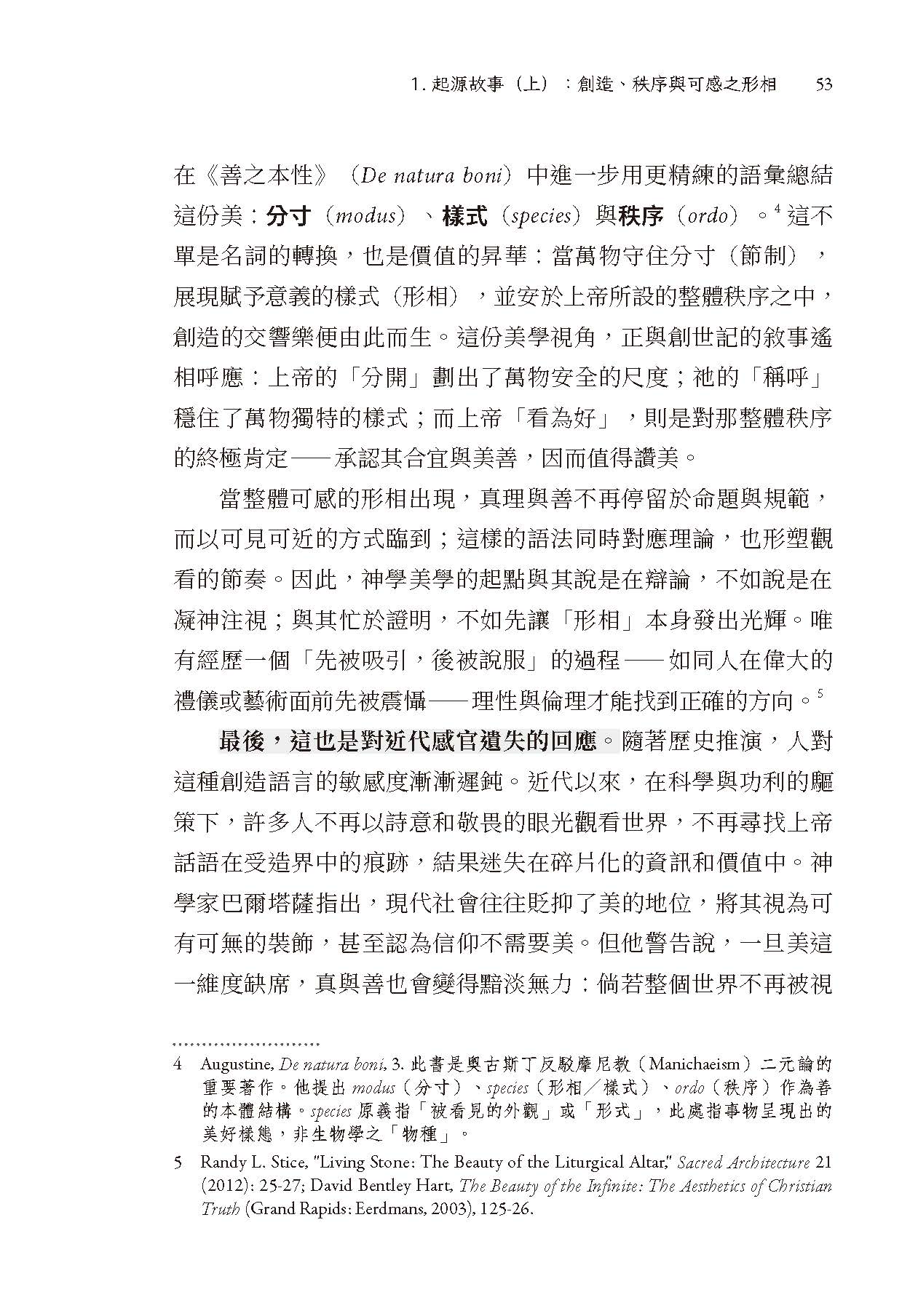 最後,這也是對近代感官遺失的回應。隨著歷史推演,人對這種創造語言的敏感度漸漸遲鈍。近代以來,在科學與功利的驅策下,許多人不再以詩意和敬畏的眼光觀看世界,不再尋找上帝話語在受造界中的痕跡,結果迷失在碎片化的資訊和價值中。神學家巴爾塔薩指出,現代社會往往貶抑了美的地位,將其視為可有可無的裝飾,甚至認為信仰不需要美。但他警告說,一旦美這一維度缺席,真與善也會變得黯淡無力:倘若整個世界不再被視為美的載體,善就失去了吸引力和自明性,人也會把上帝誤解為冰冷的存在碎片,不再具備可親的內在價值。這意味著,若我們無法讀懂創造的語言,看不見其中閃耀的榮美,整個世界在我們眼中就可能淪為無序的物質堆積,任憑人為地加以操控和塗色。因此,重新找回「閱讀創造語法」的能力,治癒當代神學的「美學失憶症」(aesthetic amnesia),正是恢復信仰感受力的關鍵。真正貼近自身對象的神學,絕不可能是醜陋乾枯的,因為上帝的真理與榮耀原本就透射出美的光輝。7 創造的語法隱含著上帝的心意與美意,我們只有帶著開放與讚嘆之心去研讀,才能不斷體會那起初所發出的聲音:「看哪,這是好的。」