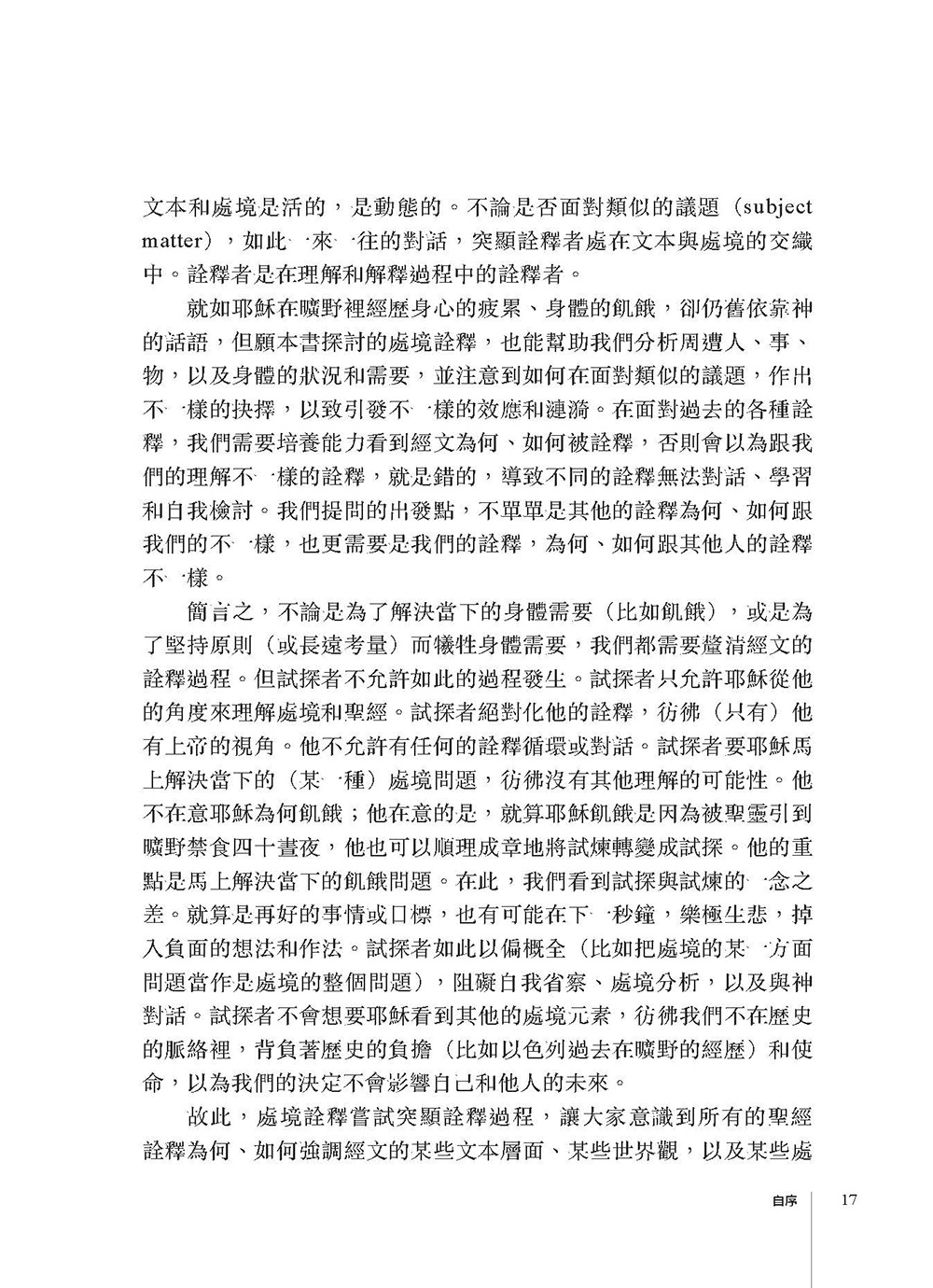 本書主張處境詮釋(contextual biblical interpretation)所突顯的處境的多樣性和動態性,以及處境之間的互動和相互影響,能幫助我們更多意識到神的同在,以致不斷思考如何與神同行?但我們要注意,如果處境詮釋過於強調自身的處境,以致無限放大?普世(universalize)和絕對化(absolutize)其處境,那處境詮釋會失去其處境性?換言之,當我們愈重視各別處境時,我們就愈應該要重視處境詮釋的公共性?我們不能只意識到自己的處境,而忽略其他處境的重要性?另一方面,當我們愈強調處境的超越性(比如處境之間,不論現在還是過去,的共同點)時,我們有可能變成只強調個人的處境而已?我們有可能認為既然處境有其超越性,就不在意各個處境的特色?所以,在詮釋聖經時,本書也在意聖經如何保有其主體性,不被我們的詮釋物化,彷彿無法調整?質疑或挑戰我們的詮釋?這些考量不但突顯詮釋的循環(即處境詮釋聖經,聖經詮釋處境),也讓我們意識到處境詮釋會面對的試探和試煉?