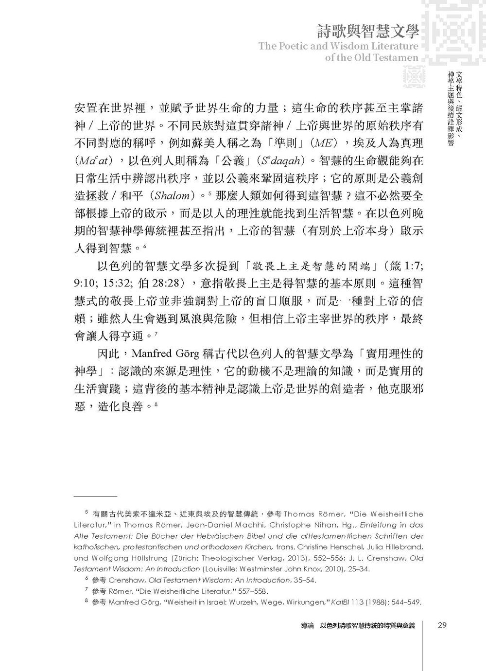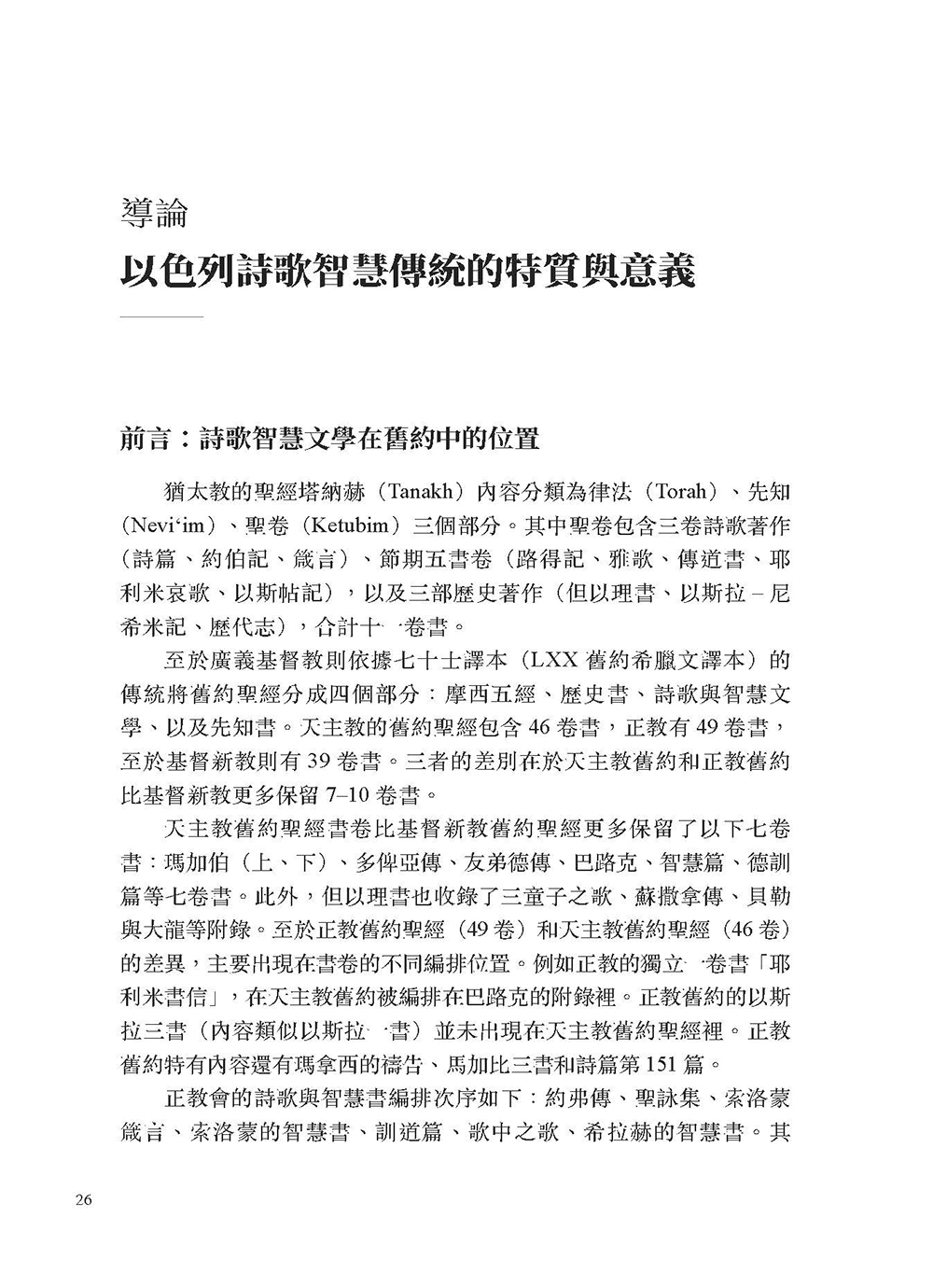 本書介紹舊約聖經詩歌與智慧文學各卷書的文學內容及相關重要主題。在導論介紹詩歌與智慧文學的結構與特色之後,逐章介紹約伯記、詩篇、箴言、傳道書以及雅歌。在各章導論之後,分別為各卷書另闢專章介紹各卷書的內容主題,對各卷書的特色做更詳細的介紹與說明,讓讀者對各卷書的內涵有更深入的了解。