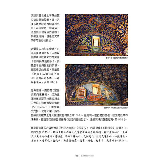 面對豐富多元、難以盡述的教堂藝術,本書以基督教藝術史中別具關鍵性的義大利地區為地域之經,以古典傳統、早期基督教階段至文藝復興初期為時間之緯,含納義大利的在地歷史淵源、拜占庭與西歐的文化交集特色,將每件猶如珍珠般的典範作品串聯一氣。作者結合其個人藝術創作涵養,歐美與紐西蘭的駐居經驗及學術研讀沉澱,帶領讀者走進時光隧道,依時序穿梭於不同地區,將教堂藝術的緣起、發展、特質、所蘊含的信仰意涵、精湛的藝術表現與藝術家個人側寫等,娓娓道來。透過平易近人的引介方式,教堂建築、其內的壁畫與鑲嵌畫、雕刻及禮儀用器等,各依其脈絡生動躍入眼前,時而華麗熱情,時而內斂沉靜。而安插文中的簡短說明單元則讓圖像傳統、時代風格、