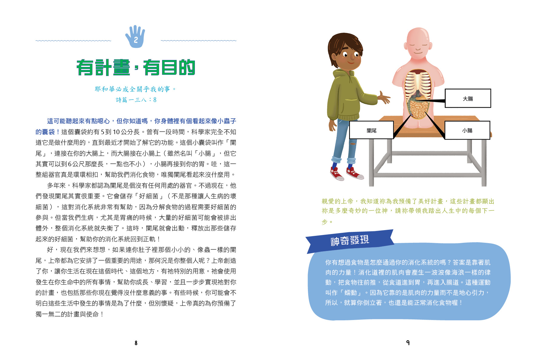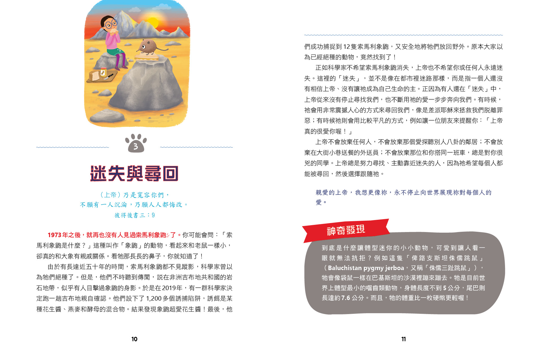 每堂課都會有驚異的「奇妙發現」,介紹有趣的科普知識、提供親身體驗的活動,最後帶你一起向上帝發出真誠的禱告與讚美。讓《上帝的100堂奇妙自然課》陪你探索世界的奧妙,並認識這位掌管天地萬物的主宰。