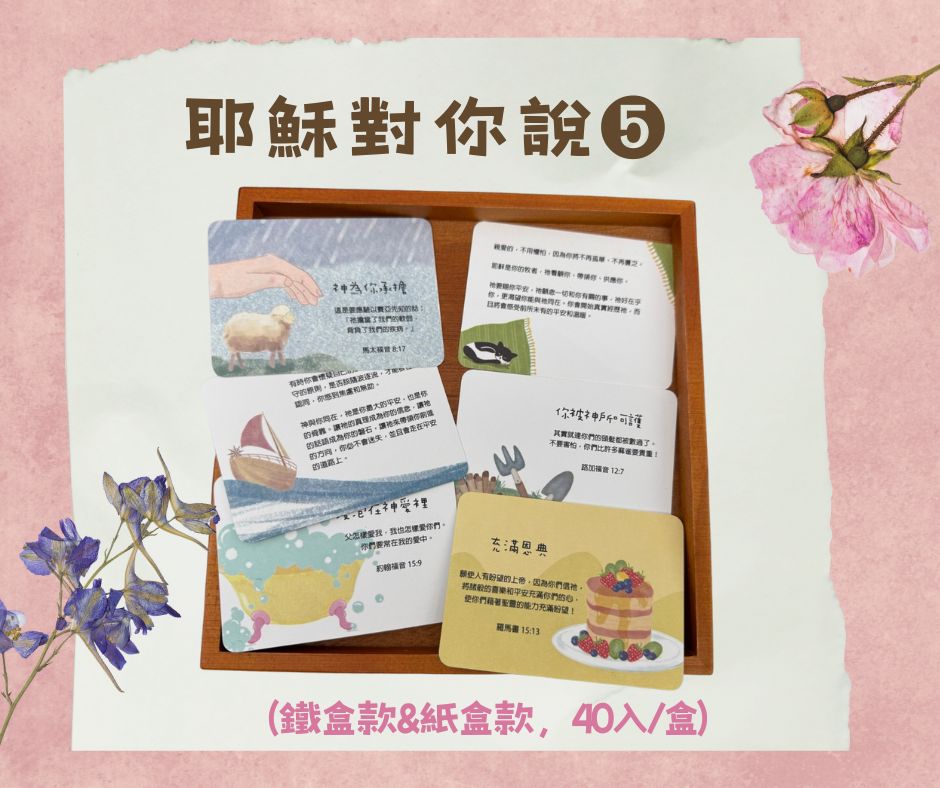特色 40種不同圖文主題經文卡,可當書籤、送禮小卡,各種場合皆可隨機應用,隨時隨地提醒耶穌要對你我說的話。