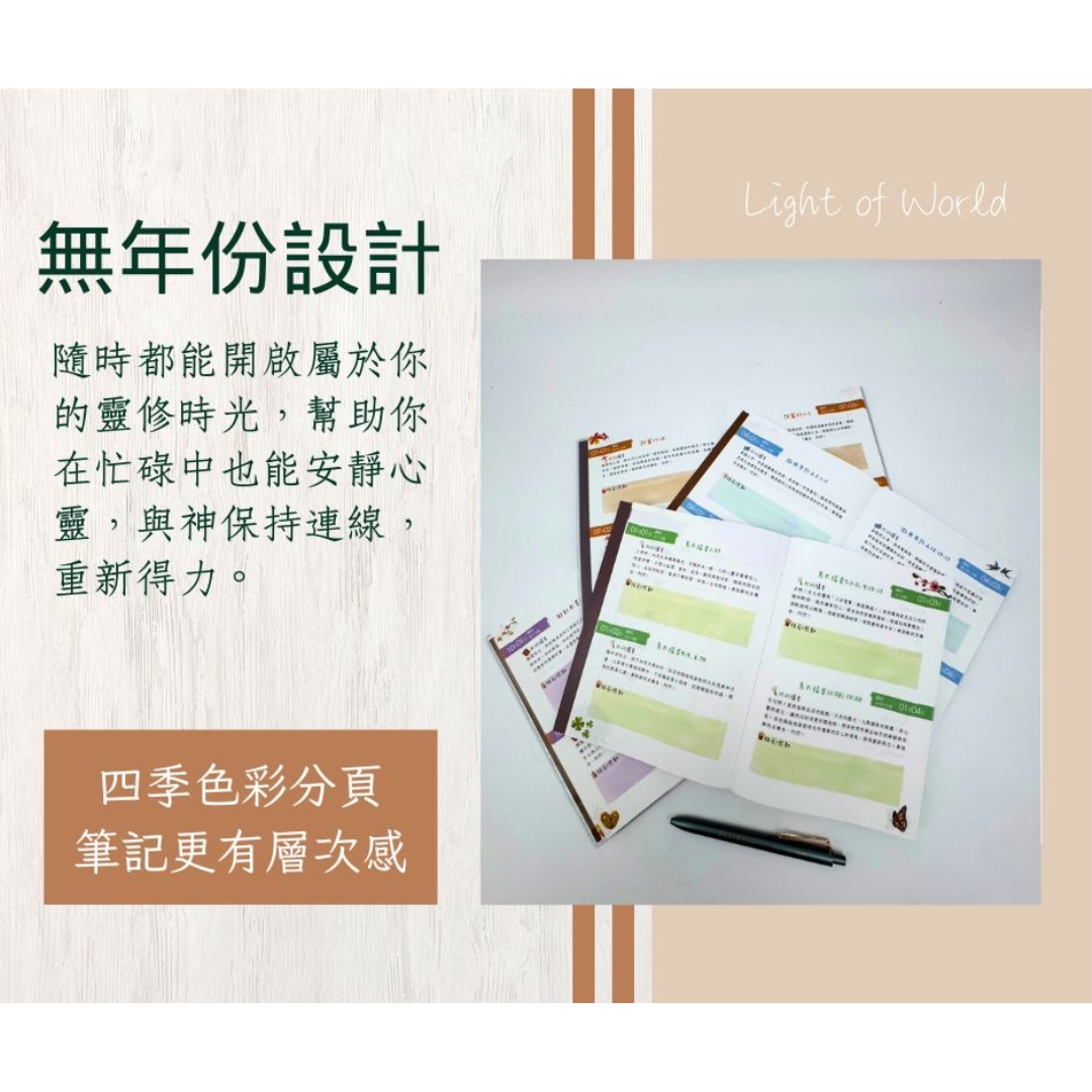這本365天全彩禱告手札,結合每日經文、禱告短文與筆記留白,陪你在一年内讀完聖經,經歷神話語的更新與豐富的恩典。無年份設計,隨時都能開啟屬於你的靈修時光,幫助你在忙碌中也能安靜心靈,與神保持連線,重新得力。